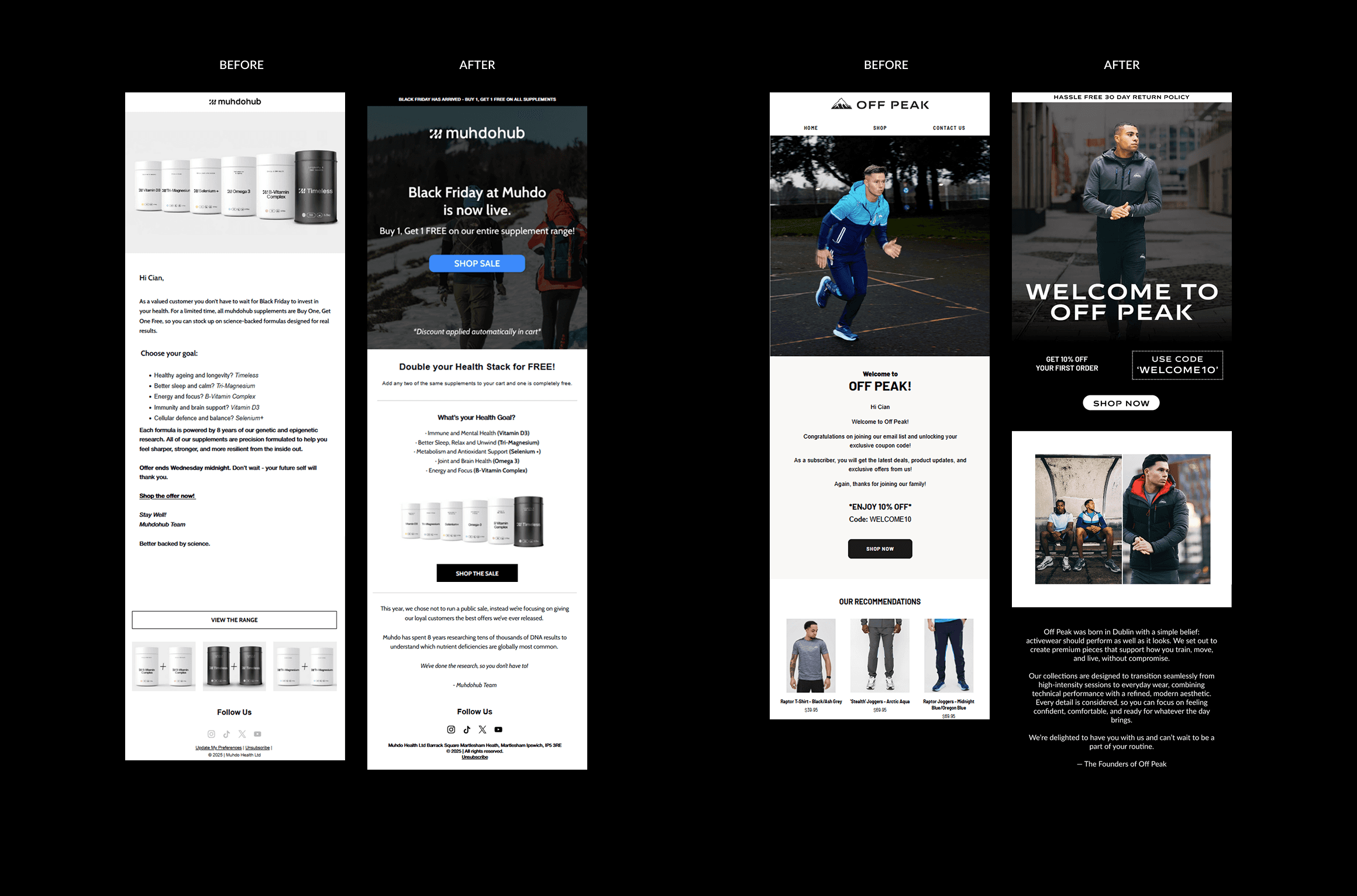 Following the audit, flows are either refined or rebuilt to improve structure, timing, creative clarity, and conversion intent. New growth initiatives are then layered on, including improved signup experiences, segmentation, and targeted campaigns designed to support long-term retention.